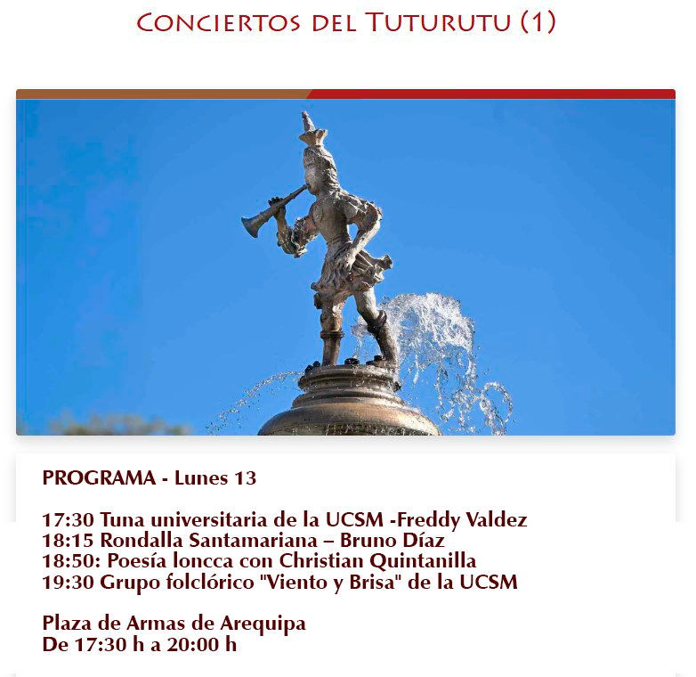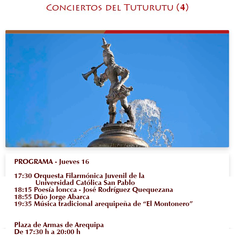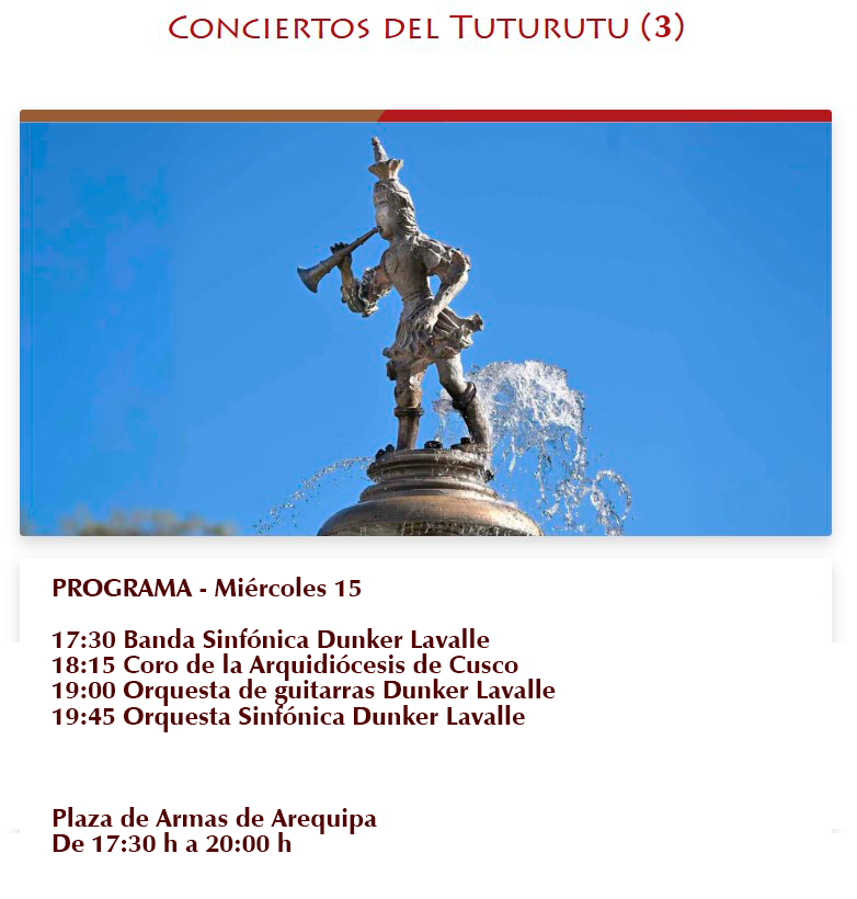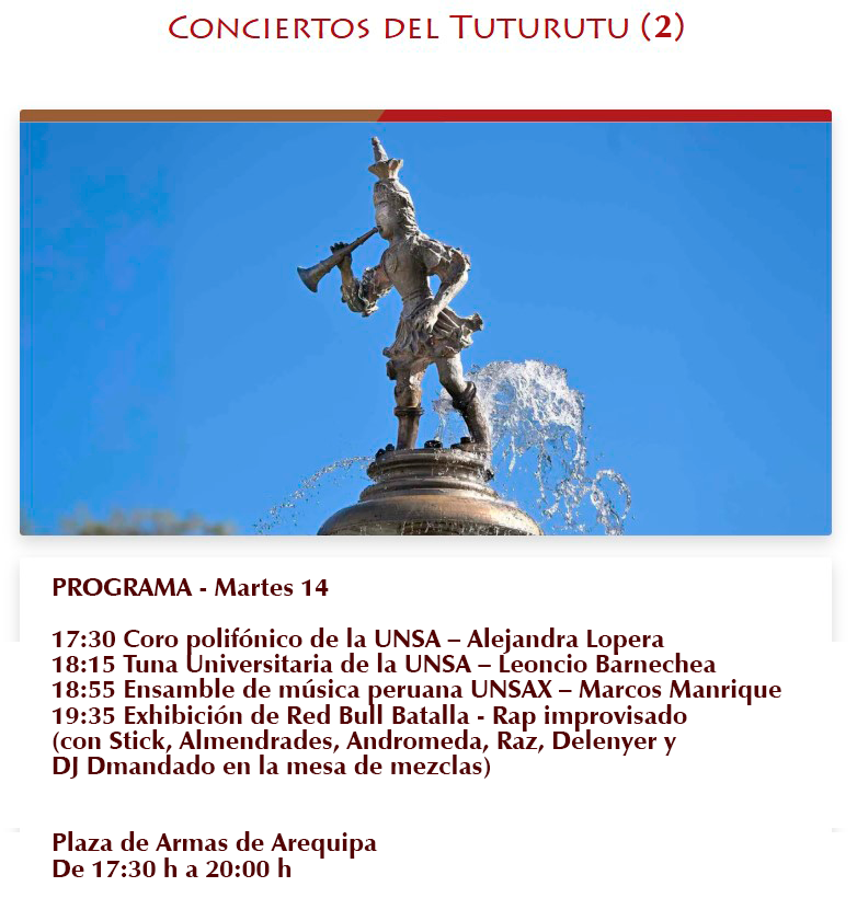 X-CILE. La plaza de Armas de Arequipa muestra lo mejor de la música arequipeña y comparte con otros músicos el legado de los mejores compositores. Elencos de las principales universidades se dan cita en el Escenario Tuturutu.