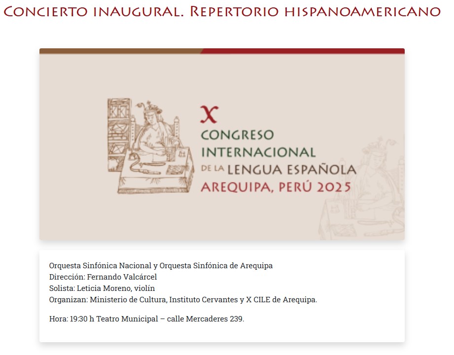 X-CILE. REPERTORIO HISPANOAMERICANO Orquesta Sinfónica Nacional y Orquesta Sinfónica de Arequipa Dirección: Fernando Valcárcel Solista: Leticia Moreno, violín Organizan: Ministerio de Cultura, Instituto Cervantes y X CILE