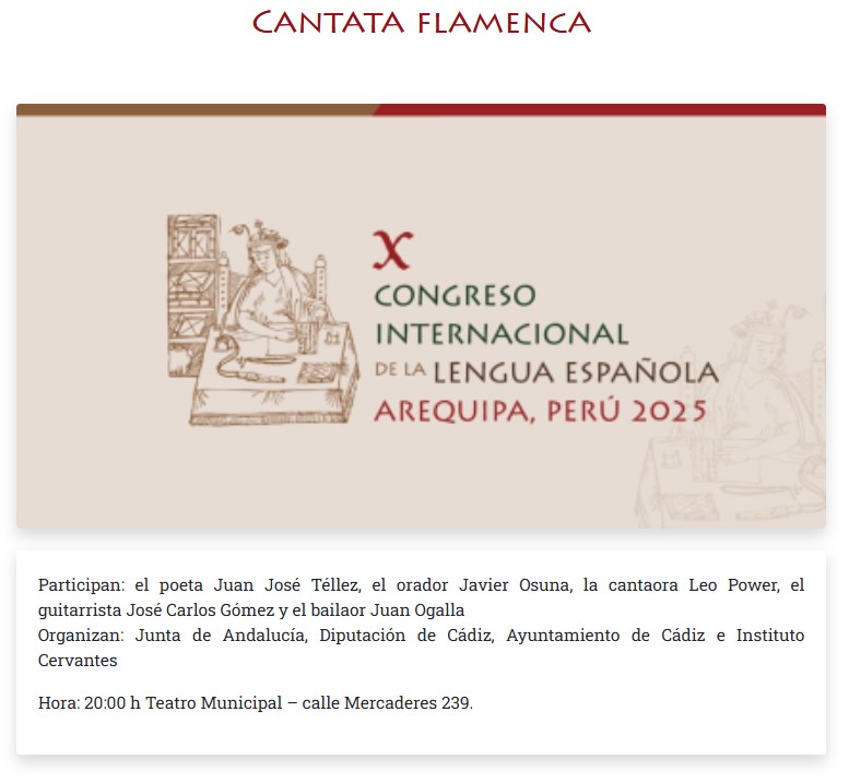 X-CILE. Participan: el poeta Juan José Téllez, el orador Javier Osuna, la cantaora Leo Power, el guitarrista José Carlos Gómez y el bailaor Juan Ogalla Organizan: Junta de Andalucía, Diputación de Cádiz, Ayuntamiento de Cádi